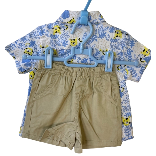 La camicia e la canotta sono realizzate in morbido cotone, offrendo il massimo comfort durante tutta la giornata. Il pantaloncino beige è resistente e pratico, con un design elegante che consente libertà di movimento. Disponibile in quattro taglie – 3-6M, 6-9M, 9-12M e 18-24M – questo completo assicura una vestibilità perfetta per ogni fase della crescita del tuo bambino.